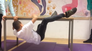 Klimmen om tafel, kan ook om een bank, bok of een medeleerling heen of een ouder! Kracht, behendigheid en "de drive" om het te kunnen!